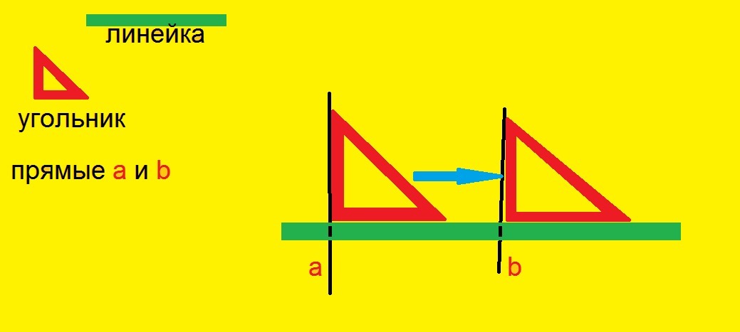 В роли третьей прямой выступает линейка, а угольник проверяет, если углы пересечения прямых а и b с линейкой равны.