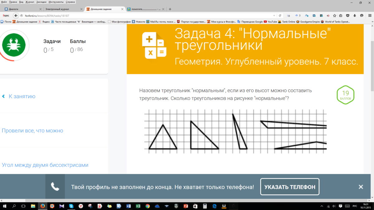 Здесь три нормальных треугольника - равносторонний, прямоугольный равнобедренный и тупоугольный равнобедренный.