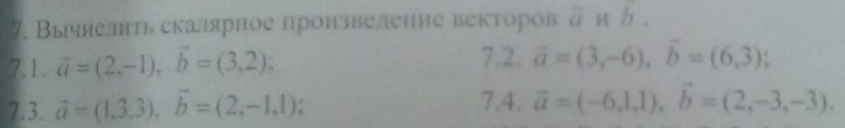 1); ; overline {a}=(2,-1); ,; overline {b}=(3,2)\\overline{a}cdot overline {b} =2cdot 3-1cdot 2=4\\2); ; overline {a}=(1,3,3); ,; ; overline {b}=(2,-1,1)\\overline {a}cdot overline {b}=1cdot 2-3cdot 1+3cdot 1=2\\3); ; overline {a}=(3,-6); ,; ; overline {b}=(6,3)\\overline {a}cdot overline {b}=3cdot 6-6cdot 3=0; ; to ; ; overline {a}perp overline {b}