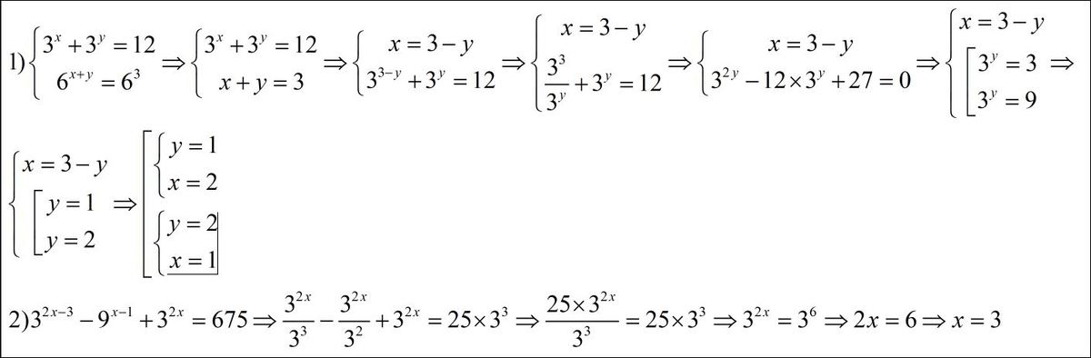 1) это система уравнений: первое уравнение 3^x+3^y=12. Второе уравнение 6^x+y=6³