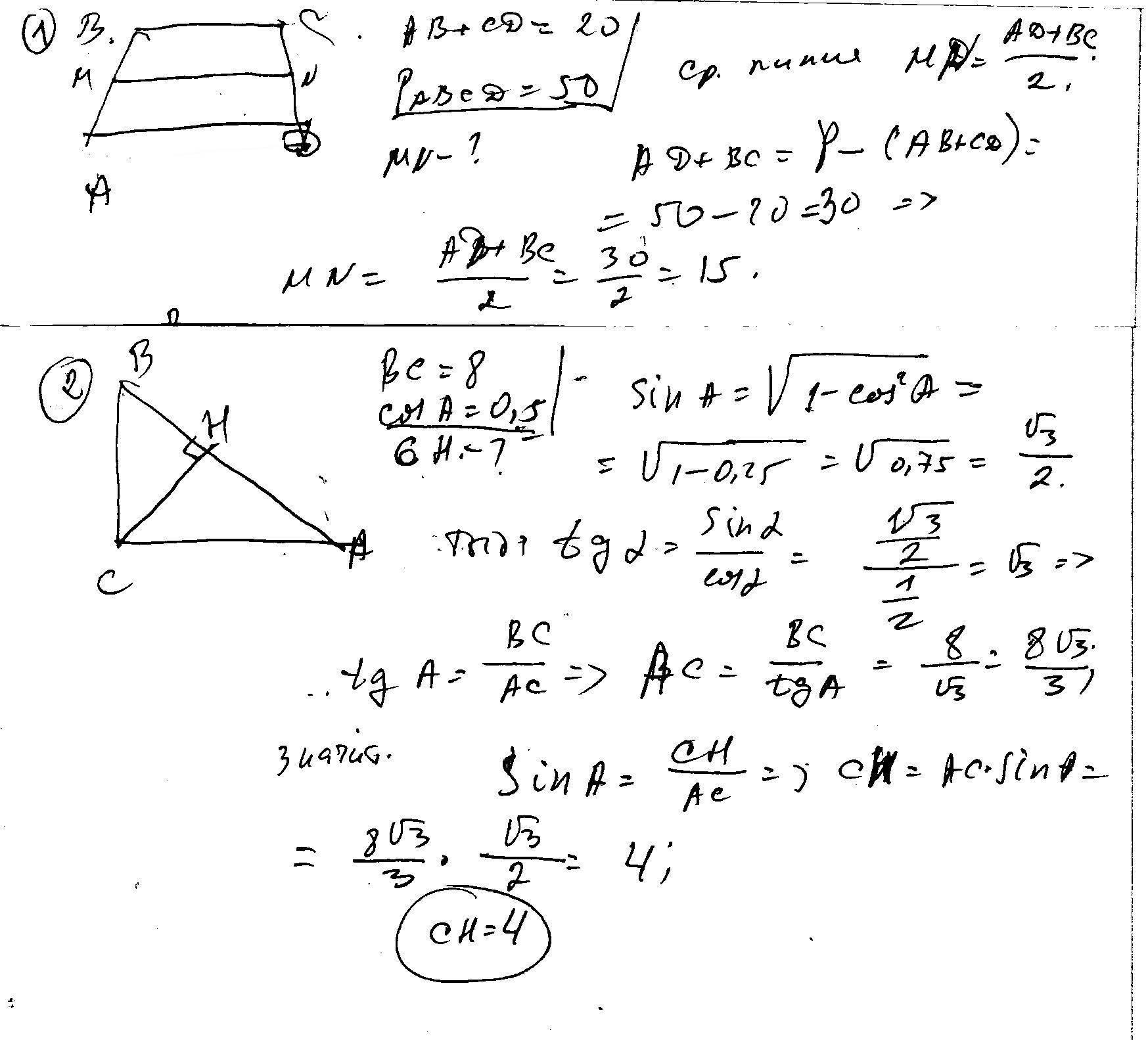 № 1. Периметр трапеции равен 50, а сумма непараллельных сторон равна 20. Найдите среднюю линию трапеции.