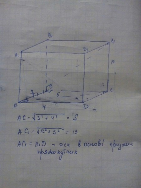 Основой прямой призмы является прямоугольник со сторонами 3 см. И 4 см. Высота призмы 12 см .. Найти диагонали призмы.