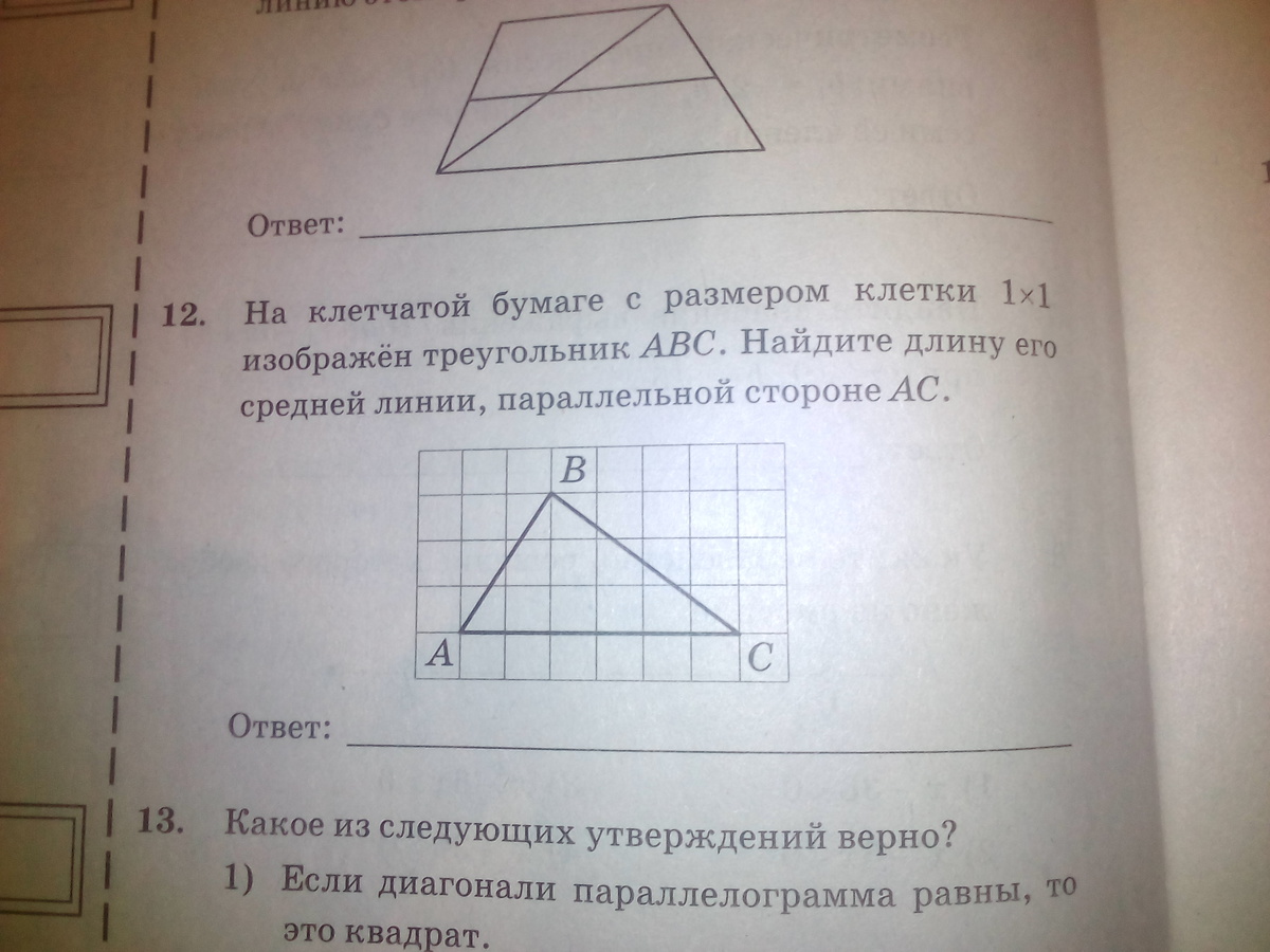 На клетчатой бумаге с размером клетки 1 см X 1 см изображен треугольник ABC. Найдите длину его средней линии, параллельной стороне AC.
