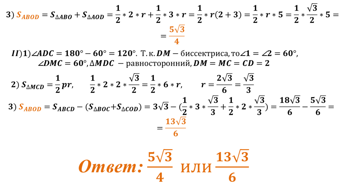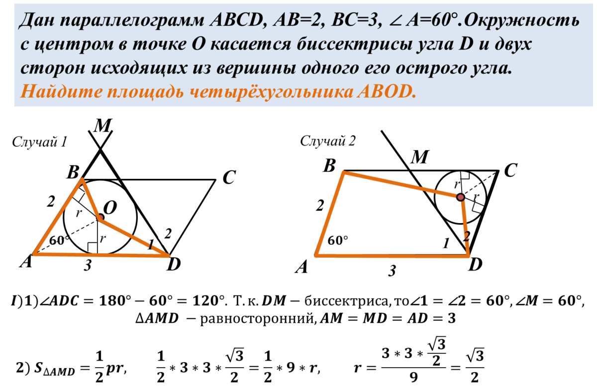 Дан параллелограмм АВСD, АВ=2, ВС=3, ∠ А=60°.Окружность с центром в точке О касается биссектрисы угла D и двух сторон исходящих из вершины одного его острого угла. Найдите площадь четырёхугольника ABOD.