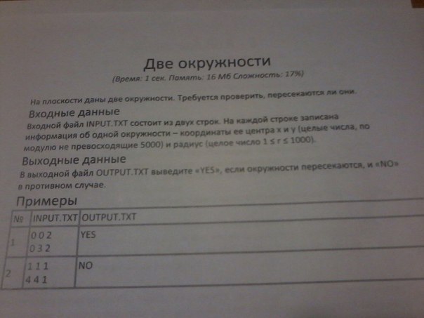 Нужно проверить пересекаются ли две окружности, через входной и выходной файлы в Паскале. Координаты их центров х и у целые числа не превосходящие по модулю 5000 и радиус целое число от 1 до 1000 включительно.