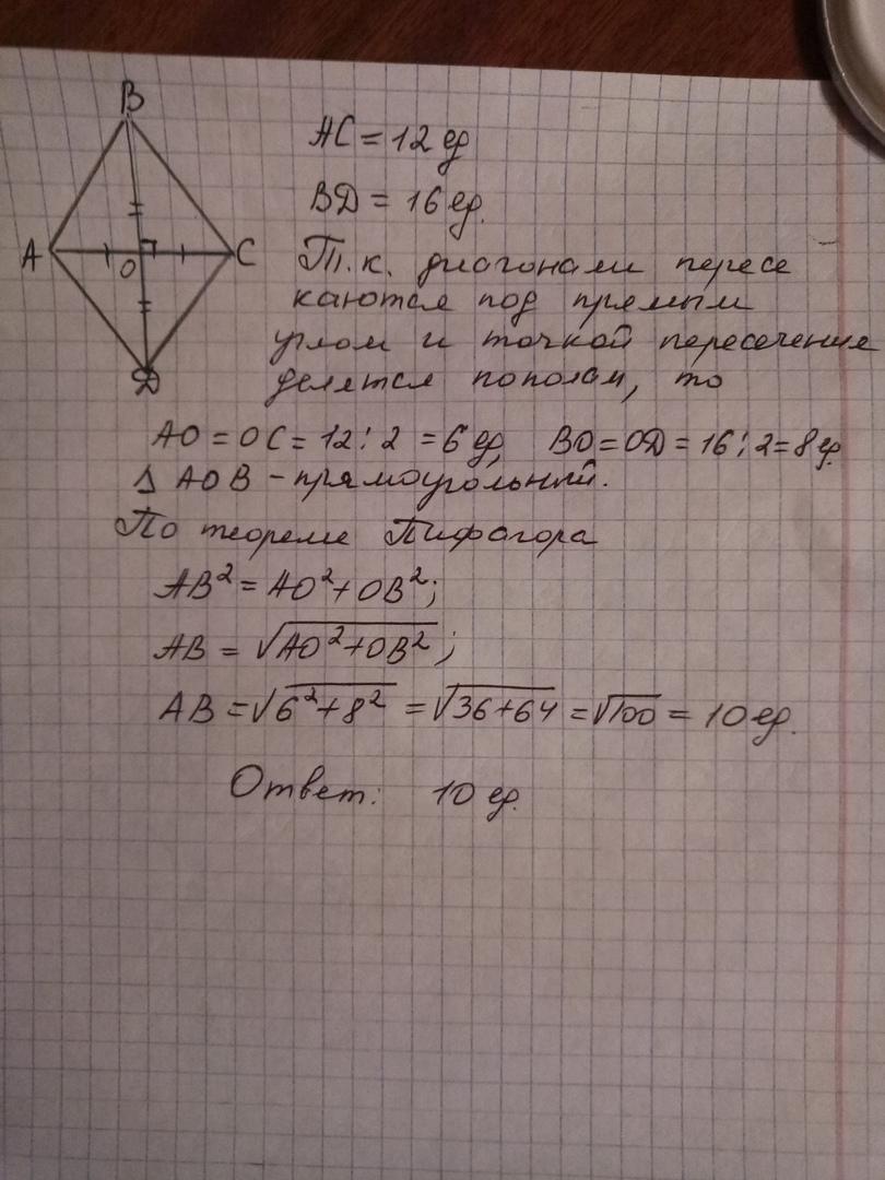 Катеты каждого - это половинки диагоналей. соответственно 12/2=6 и 16/2=8