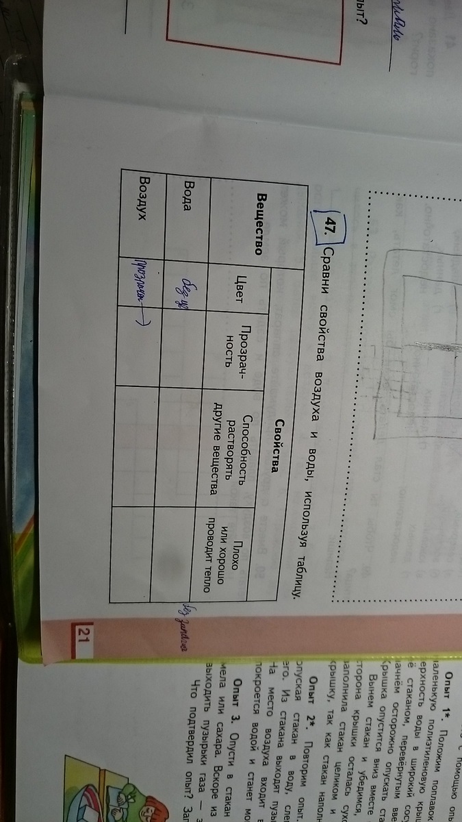 тут же всепросто вода растворяет вещества некоторые, плохо проводит тепло( с этим сомневаюсь), воздух бесцветный, нетспособности растворять...плохо проводит тепло