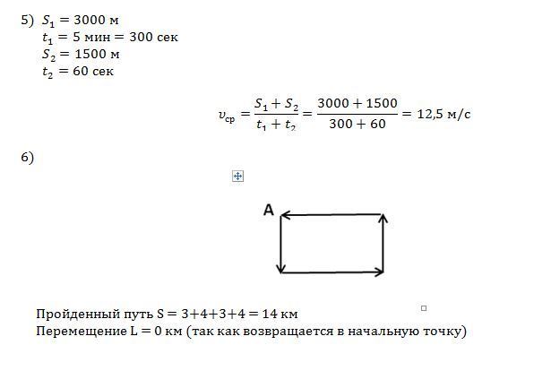 5)Автомобиль первые 3 км проехал за 5 минут, следующее 1,5 км - за 1 минуту. Найдите среднюю скорость на всём пути?