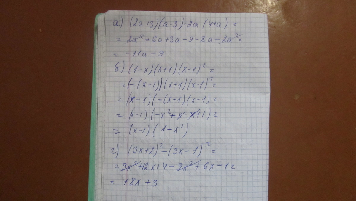 Упростите выражения:а)(2a+3)(a-3)-2a(4+a) б)(1-x)(x+1)(x-1)^2 в)(a+b)(a-2b)+(2b-a)(2b+a) г)(3x+2)^2-(3x-1)^2