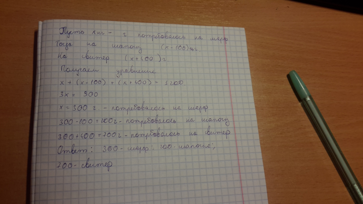 Чтобы связать свитер, шапочку и шарф взяли 1 кг 200 г шерсти. На шарф потребовалось на 100 г шерсти больше, чем на шапочку , и на 400 г меньше , чем на свитер. Сколько граммов шерсти израсходовали на каждую вещь ?