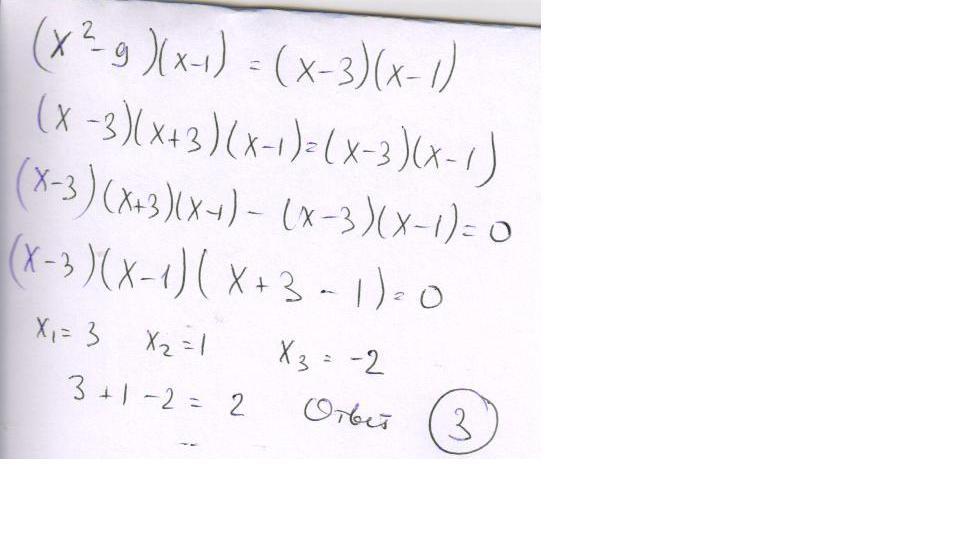 Сумма корней (корень, если он один) уравнения (х^2-9)(х-1)=(х-3)(х-1) равна: