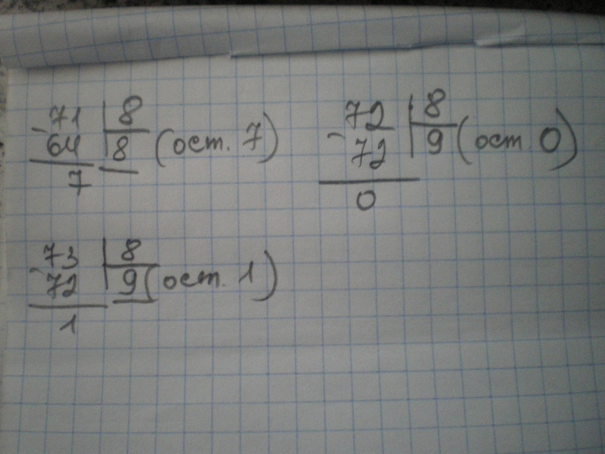 выполни деление с остатком и подеркни то исло которое показывает сколько раз делитель можно вычесть из делимого 71:8= (ост.) 7368= (ост) 72:8=(ост)