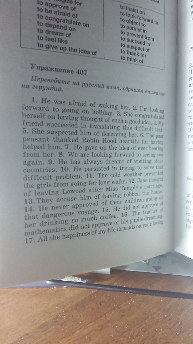 1. Он боялся разбудить ее. 2. Я с нетерпением жду отпуска (каникул). 3. Она поздравила себя с тем, что придумала такую отличную идею (что ей в голову пришла такая отличная идея). 4. Моему другу удалось перевести этот трудный текст. 5. Она подозревала, что он обманывает ее. 6. Бедный крестьянин сердечно поблагодарил Робина ГуДа за то» что тот помог ему. 7. Он оставил мысль когда-либо получить известие от нее. 8. Мы с нетерпением ждем новой встречи с вами. 9. Он всегда мечтал о том, чтобы побывать в других странах. 10. Он упорствовал в попытках решить эту трудную проблему (задачу). 11. Холодная погода мешала (не давала) девушкам ходить на длинные прогулки. 12. Джейн подумывала о том, чтобы уехать из Лоувуда после того, как мисс Темпл вышла замуж. 13. Они обвиняют его в ограблении дома. 14. Он никогда не одобрял того, чтобы их дети отправились в это опасное путешествие. 15. Он не одобрял того, что она пьет так много кофе. 16. Учителю математики не нравилось, когда его ученики предавались мечтаниям. 17. Все счастье моей жизни зависит от вашей любви ко мне. 18. Мне не хочется (я не расположен) видеть его. 19. Я настаиваю на том, чтобы мне сказали правду. 20. Я возражаю против того, чтобы он занимал у тебя деньги.