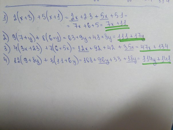 1) 2 (x+3)+5 (x+1); 3) 4 (3x+23)+7 (6+5x)