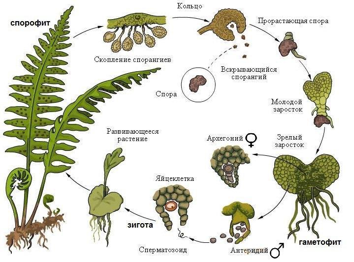 Долго скрывал свою тайну папоротник. Что не цветет он вовсе. Нет у него цветов. Зато это одно из древнейших растений на свете, которые жили еще вместе с динозаврами. Образует папоротник споры, которые попадая на важную землю дают начало маленькому заростку - половому поколению папоротника - гаметофиту. На заростке образуются женские и мужские половые клетки, которые сливаясь дают начало папоротнику - бесполому поколению - спорофиту.