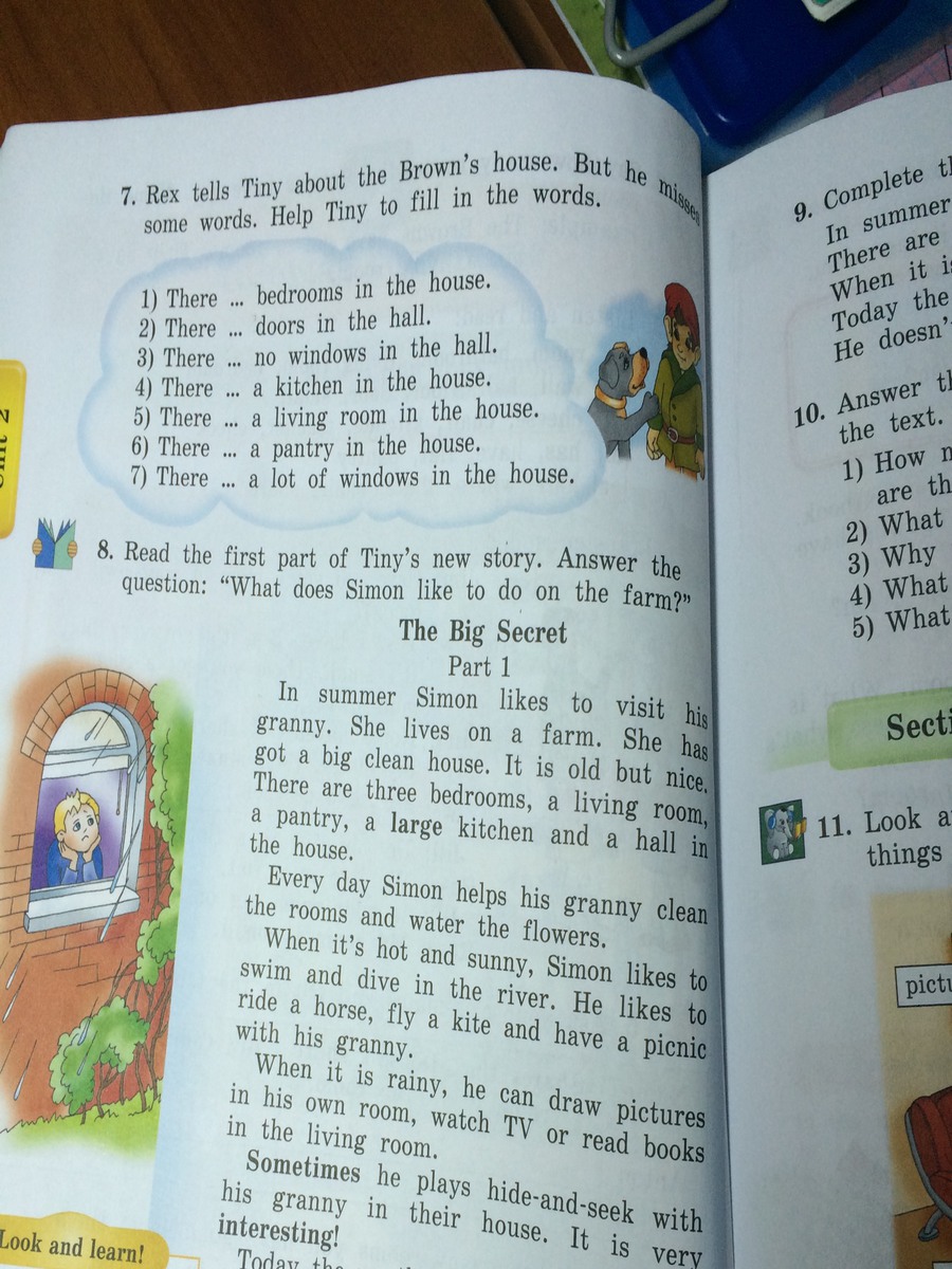 Рекс говорит о Крошечный дом Брауна. Но он некоторые слова. Помощь Крошечные заполнить слов. 1) Там спален в доме. 2) Там двери в зале. 3) Там нет окон в зале 4) Там кухня в доме. 5) Там гостиная в доме. 6) Там кладовая в доме. 7) Там много окон в доме. Читайте первую часть новой истории Тайни. Ответьте на вопрос:. "Что Симон нравится делать на ферме н Большой секрет часть 1 летом Саймон любит, чтобы навестить свою бабушку, она живет на ферме она приобрела большую чистый дом Это старый, но приятно... Есть три спальни, гостиная, кладовая, большая кухня и зал в доме. Каждый день Симона помогает его бабушка чистые номера и водные цветы. Когда жарко и солнечно, Саймон любит плавать и нырять в Река. Он любит ездить на лошади, летать змей и устроить пикник с его, когда он находится дождей, он может нарисовать в своей комнате waien телевизор или читать книги в гостиной ROM Sometimou 1