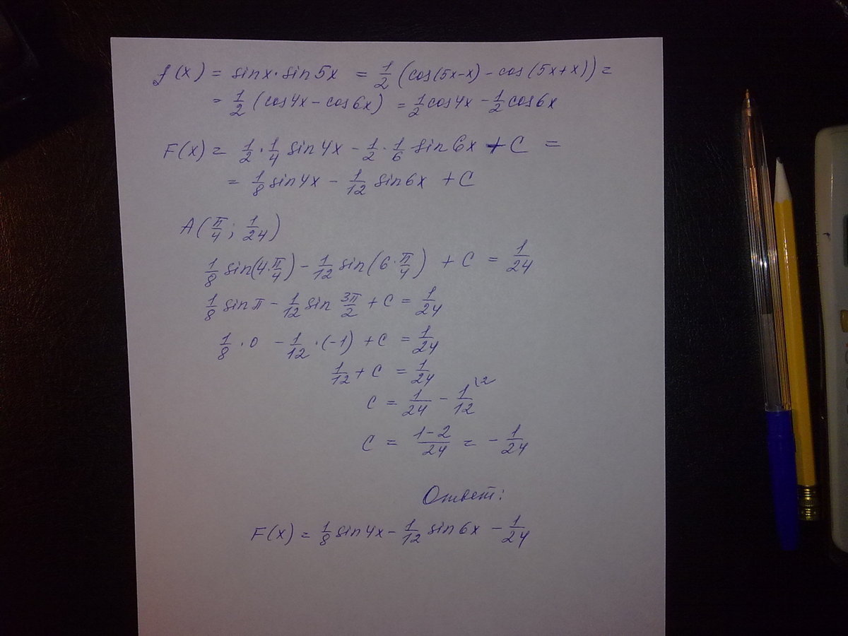 Для функции f(x) = sinxsin5x найдите первообразную, график которой проходит через точку А с координатами ( пи/4: 1/24)