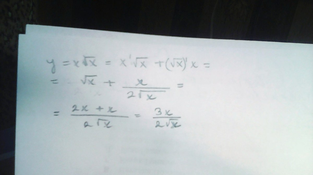 y'(x) = (x√x)'= x'√x + (√x)'x= √x + x/(2√x)= (2x+x)/ (2√x)= 3x/(2√x)