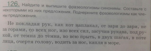 Как кот наплакал-капля в море,не за горами-в двух шагах,от зари до зари-от темна до темна,во всю прыть-со всех ног,в поте лица-изо всех сил,засучив рукава-не покладая рук,очертя голову-водить за нос. Ссори если ошибся