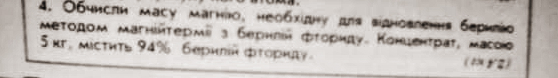 вычислите массу магния, необходимую для обновления берилия методом магнитермии с берилием хлорид. концентрат, массой 5кг вмещает 94% берилий фторид.