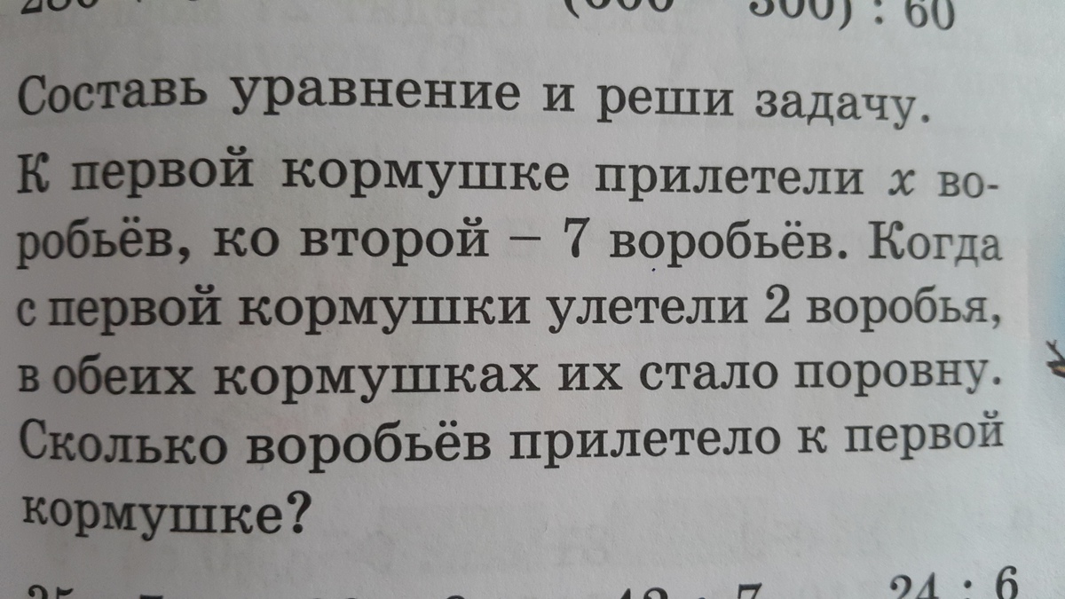 составь уровнение и реши задачу. к первой кормушке прилетели x воробьев, ко второй - 7 воробьев. когда с первой кормушки улетели 2 воробья, в обеих кормушках их стало поровну. сколько воробьев прилетело к первой кормушке?