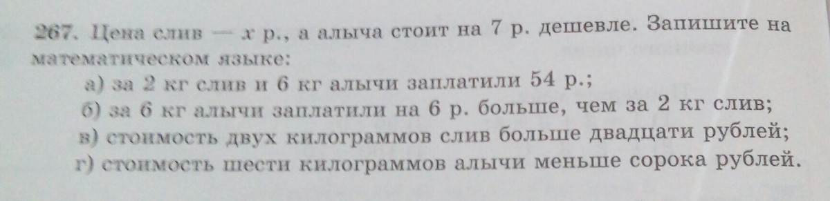 т.к. 6(х-7) р стоят 6 кг алычи, а 2х руб 2 кг слив, что на 6 руб дешевле, чем 6 кг слив. Понятно ли?