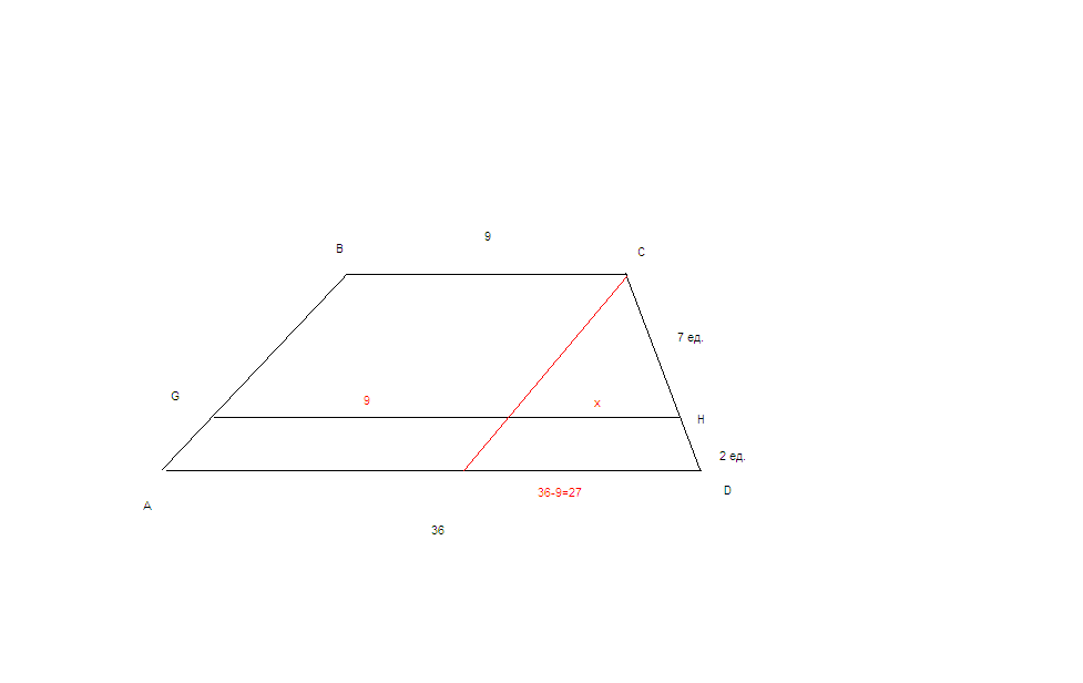 В трапеции ABCD на боковой стороне CD отмечена точка H так,что CH:HD=7:2.Прямая HG параллельная основаниям BC и AD,пересекает сторону AB в точке G.Найдите GH,если BC=9,AD=36.
