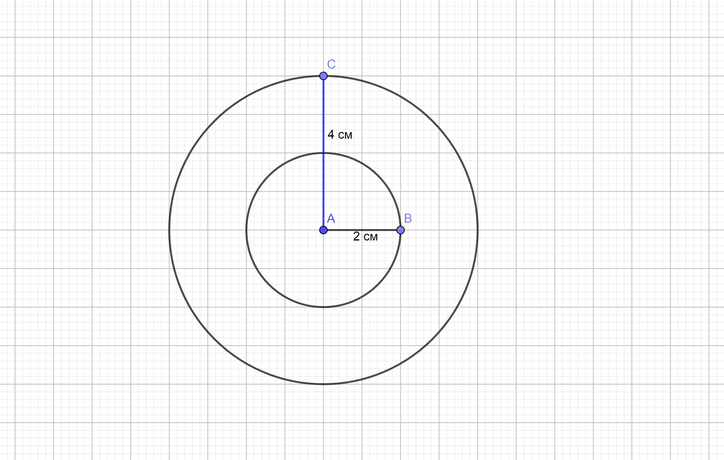 начерти окружность с радиусом длиной 2 см. Начерти другую окружность с тем же центром и радиусом длиной 4 ам