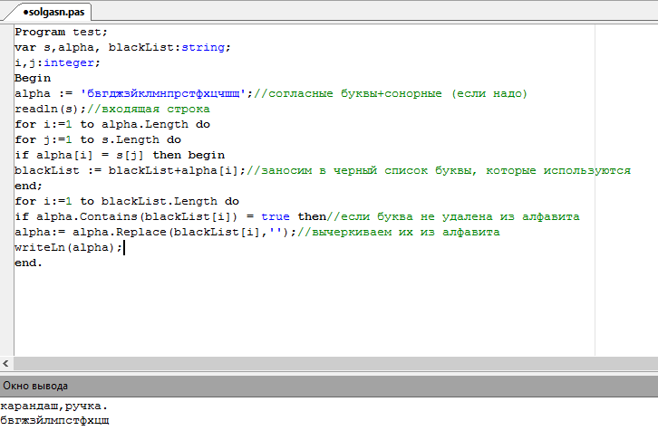 Дана строка из строчных русских букв, между соседними словами запятая, за последним словом точка. Составить программу, печатающую в алфавитном порядке: