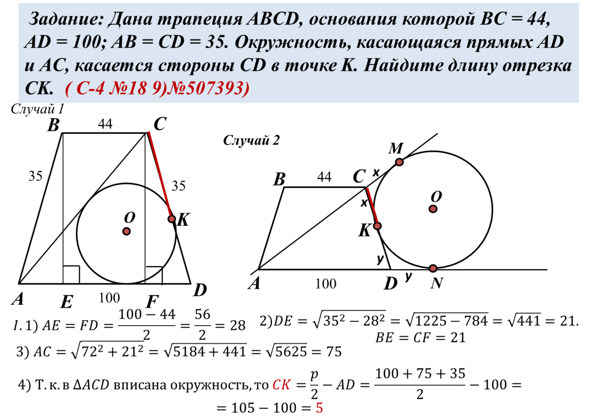 Дана трапеция ABCD, основания которой BC = 44, AD = 100; AB = CD = 35. Окружность, касающаяся прямых AD и AC, касается стороны CD в точке K. Найдите длину отрезка CK.