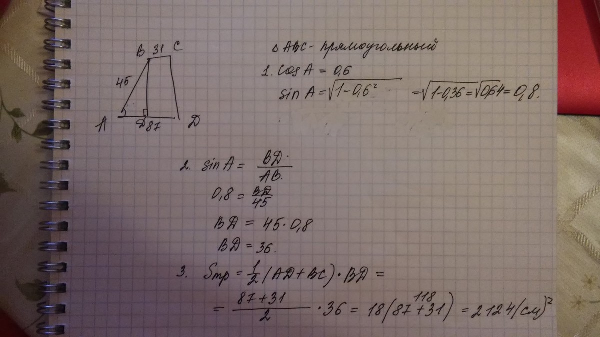 основания трапеции равны 31 и 87,одна из боковых сторон равна 45,а косинус между ней и одним из оснований равен 0,6.Найдите площадь трапеции.