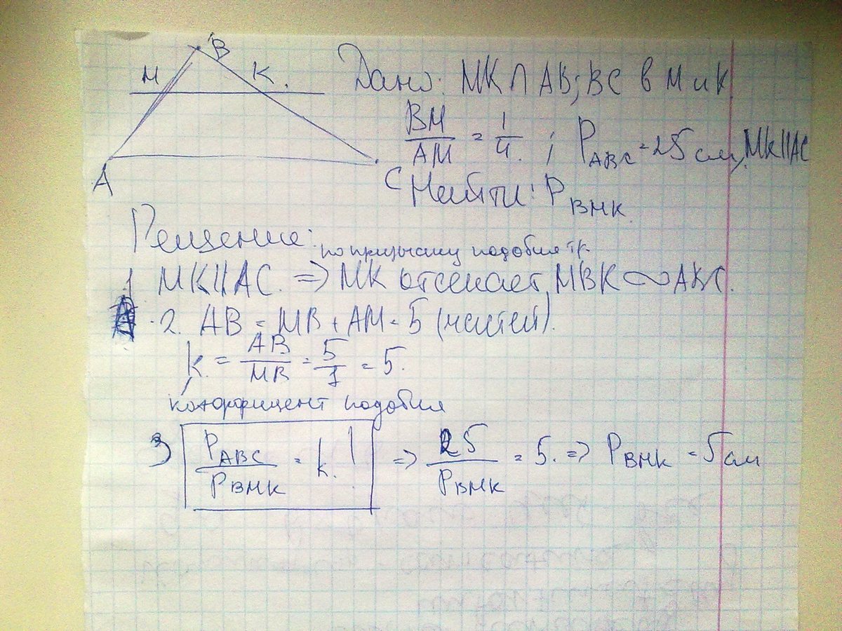 Прямая пересекает стороны треугольника ABC в точках M и K соответственно так,что MK параллельна AC, BM:AM=1:4.Найти периметр треугольника BMK,если периметр ABC=25см.