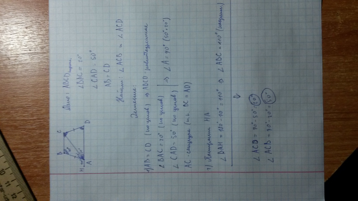 В трапеции ABCD известно,что AB=CD, угол BAC=20 градусов, угол CAD = 50 градусов. Найдите углы ACB и ACD