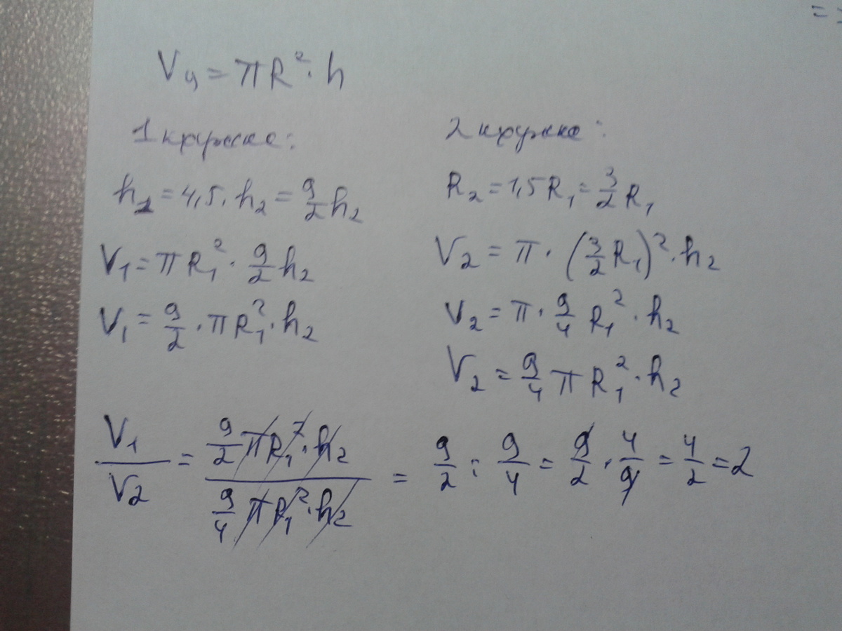 Две кружки имеют форму цилиндра. Первая кружка в четыре с половиной раза выше второй, а вторая в полтора раза шире первой. Во сколько раз объем первой кружки больше объема второй?