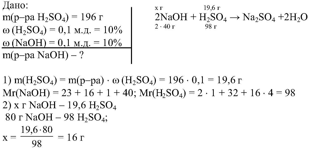 сколько граммов раствора содержащего 0.1 массовых долей или 10%,гидроксида натрия,потребуется для нейтрализации 196 г раствора,содержащего 0,1 массовых долей,или 10%,серной кислоты