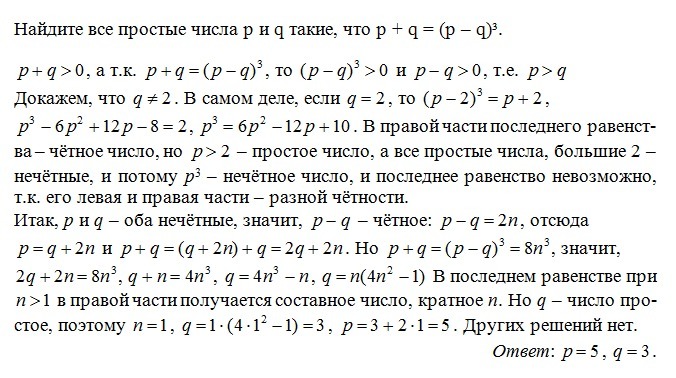 Найдите все простые числа p и q такие, что p + q = (p – q)³.