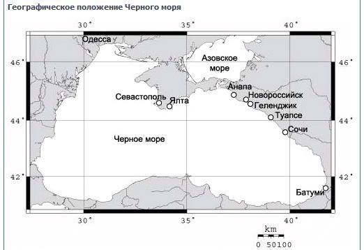 Черное море расположено между 46°33'- 40°56' с. ш. и 27°27'-41°42' в. д.