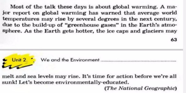 Большинство разговоров сегодня ведётся о глобальном потеплении. В основном отчёте о глобальном потеплении содержится предупреждение, что из-за скопления газов, создающих парниковый эффект в атмосфере Земли, в следующем веке средняя температура в мире повысится на несколько градусов. С повышением температуры на Земле полярный лёд и ледники могут растаять, что вызовет подъём уровня моря. Надо действовать до того, как мы утонем! Давайте займёмся экологическим просвещением.