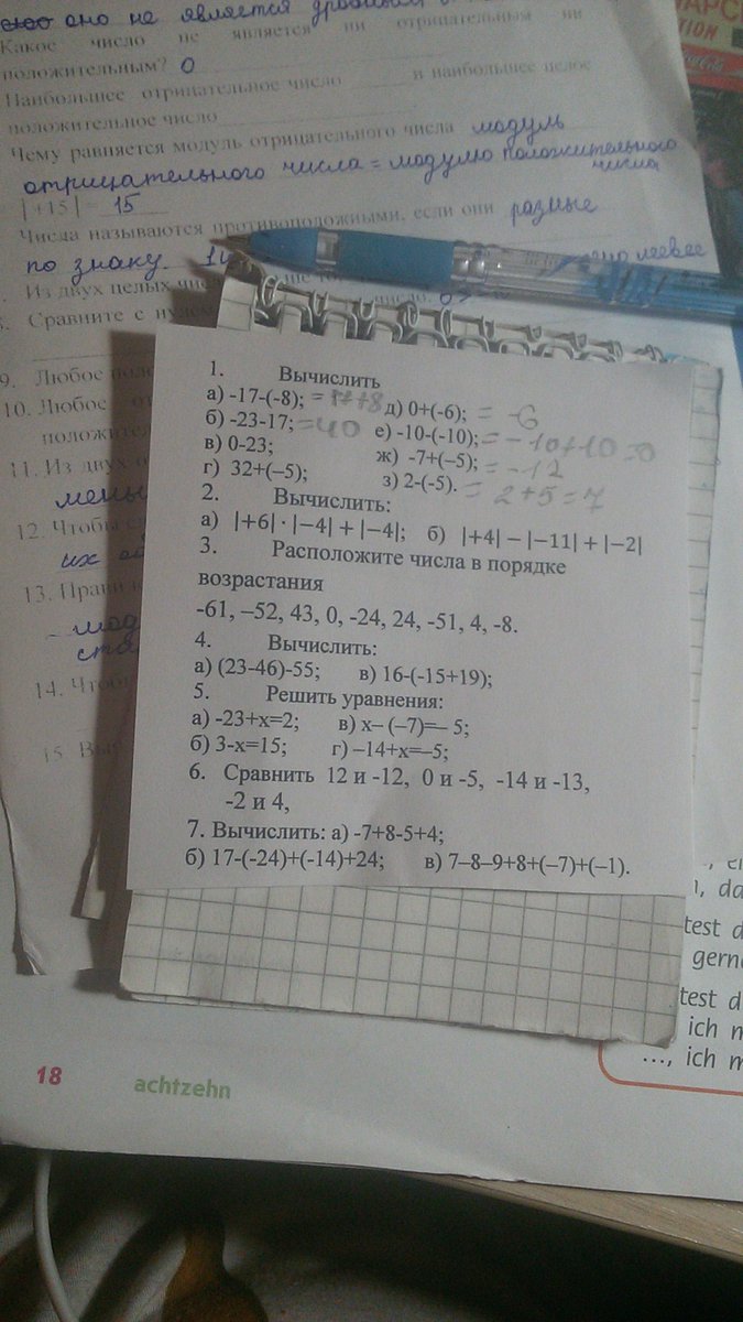 1.а) 0-23 б) 32+(-5) в) |+6|×|-4|+|-4| г) |+4|-|-11|+|-2| 3. расположите числа в порядке возрастания -61,-52,43,0,-24,24,-51,4,-8. 4. а) (23-46)-55; в) 16-