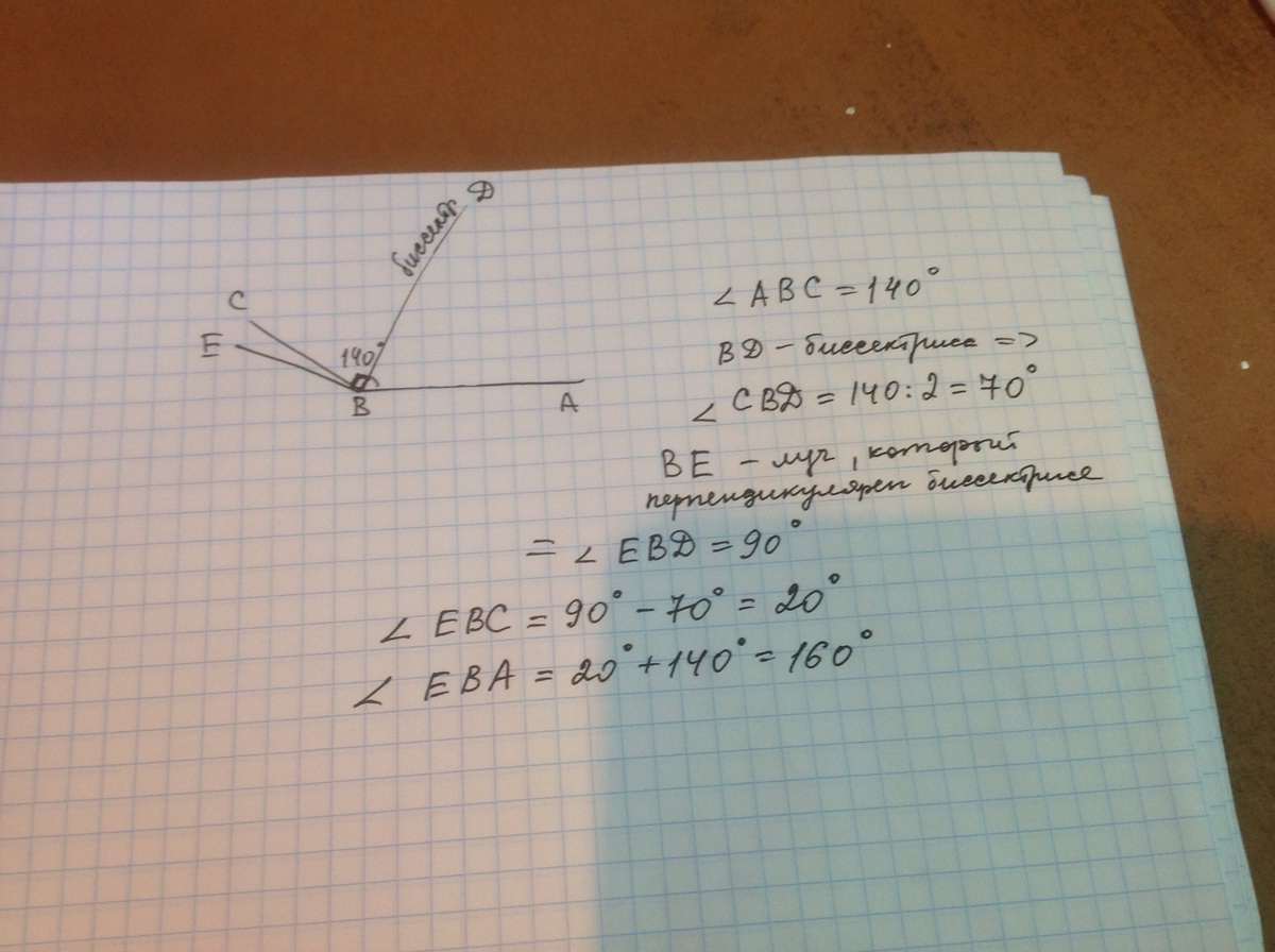 Из вершины угла равного 140 проведен луч перпендикулярный биссектрисе данного угла.
