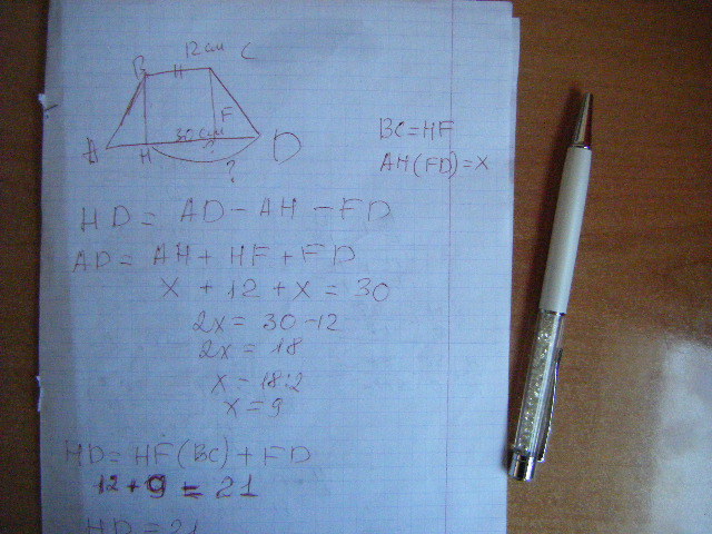В равнобедренной трапеции ABCD основания BC=12см и AD=30см. Из вершины В на основание AD опущена высота BH. Найдите HD.