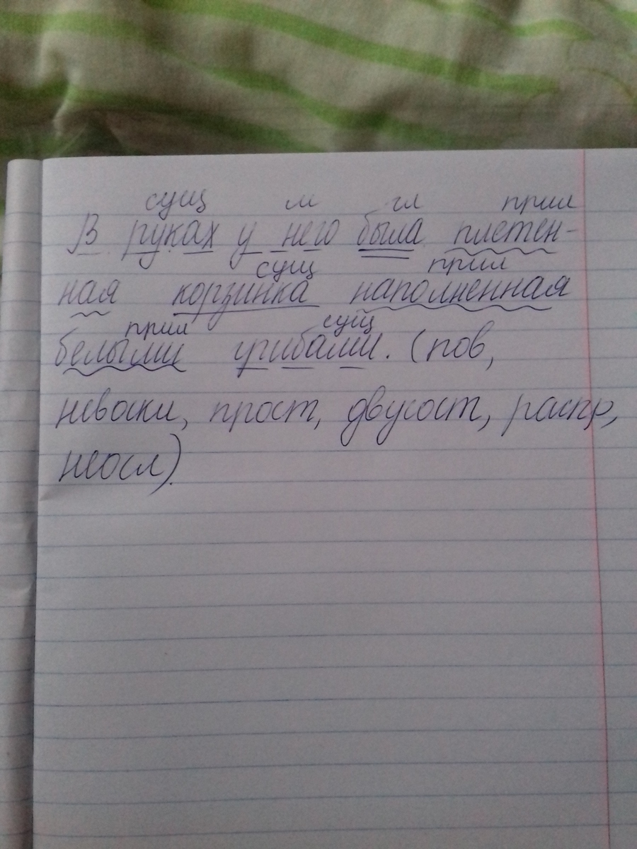Помогите пожалуйста зделать синтаксический разбор предложения :В руках у него была плетенная корзинка наполненная белыми грибами.