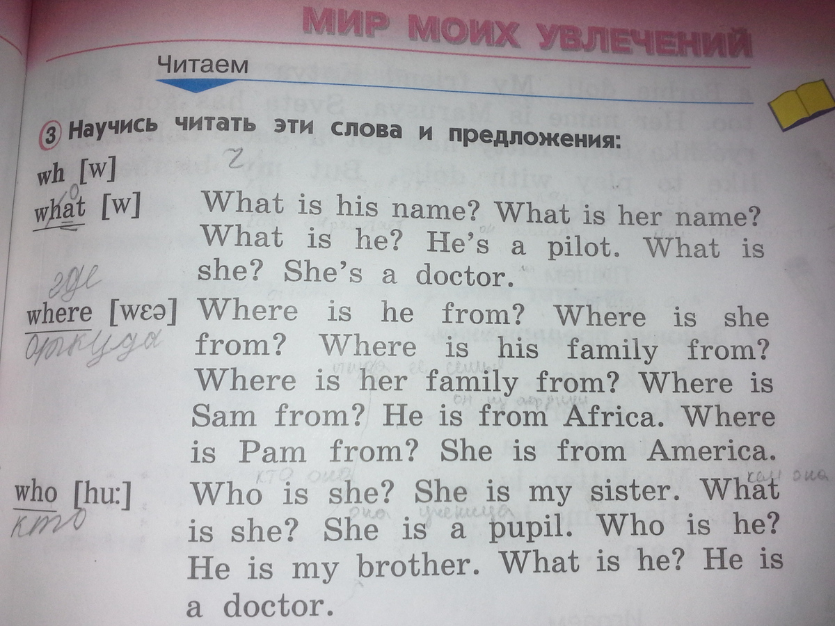 Как его зовут? Как ее зовут? Кто он? Он пилот. Кто она? Она доктор. Откуда он?Откуда она? Откуда его семья? Откуда ее семья? Откуда Сэм? Он из Африки. Откуда Пэм? Она из Америки. Кто она? Она моя сестра. Кем она является? Она ученик. Кто он? Он мой брат. Кто он? Он доктор.