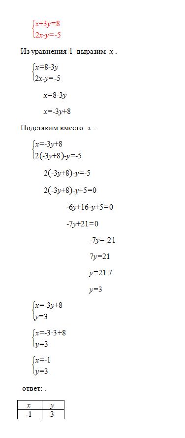 a) {x+3y=8 {2x-y=-5 б) {3m-4n=20 {m+2n=0 в) {x+z/2=1 {x-z=3 г) {2x+5y=-3 {4x+3y=-27 д) {t-5s=0 {2t-s=9 е) {y/3-z/2=1/2 {2y+3z=1