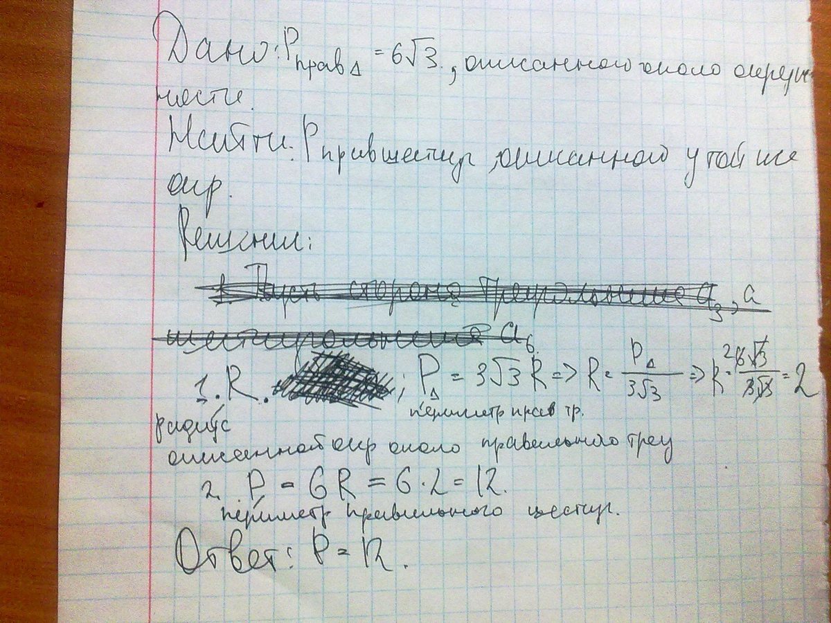 Периметр правильного треугольника,вписанного в окружность ,равен 6√3.Найдите периметр правильного шестиугольника,описанного около той же окружности.