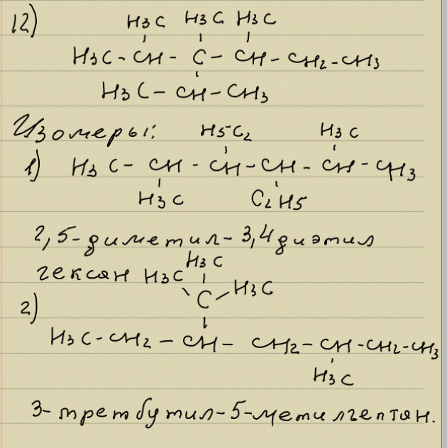 12)Составьте структурную формулу 2,3,4-триметил-3-изопропилгексана.Приведите структурные формулы двух изомеров, назовите их по номенклатуре ИЮПАК.