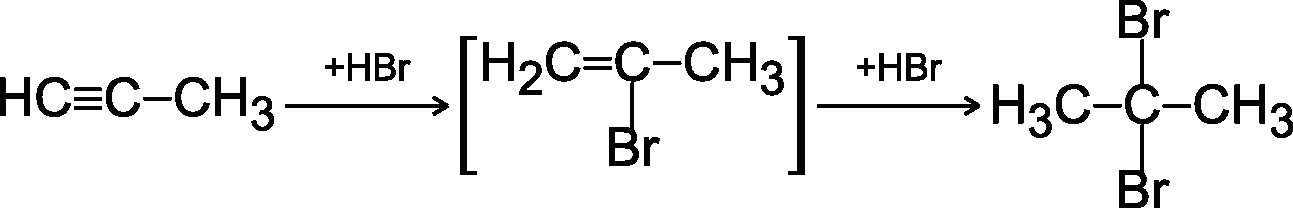 Бромоводород присоединяется к пропину в соответствии с правилом Марковникова (через стадию образования 2-бромпропена-1) образуя 2,2-дибромпропан. (см. рисунок)