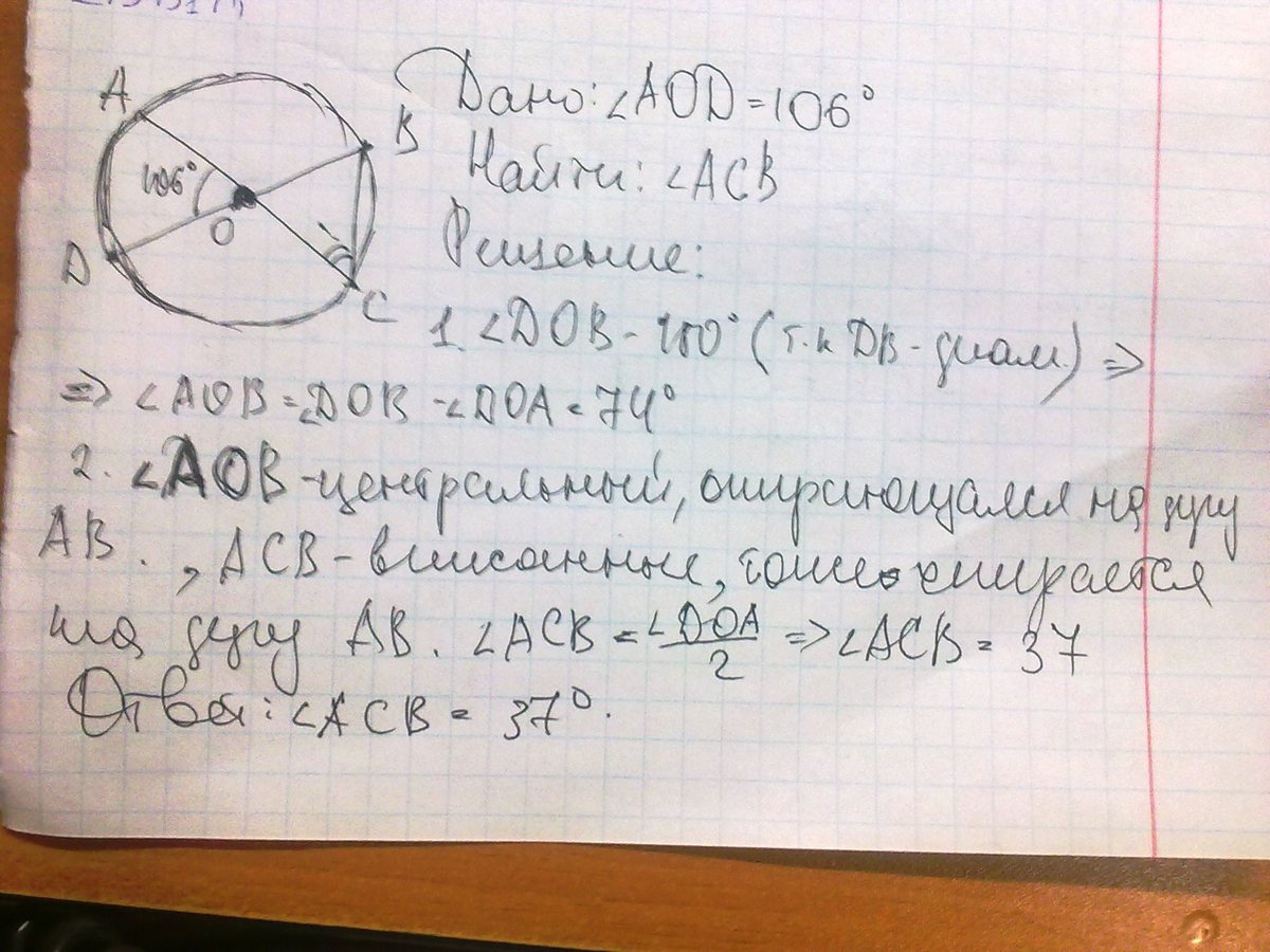 В окружности с центром O АС, и BD диаметра. Центральный угол AOD равен 106 (градусов ) Найдите вписаный угол ACB Ответ дайте в градусах. пожалуйста помогите решить а?