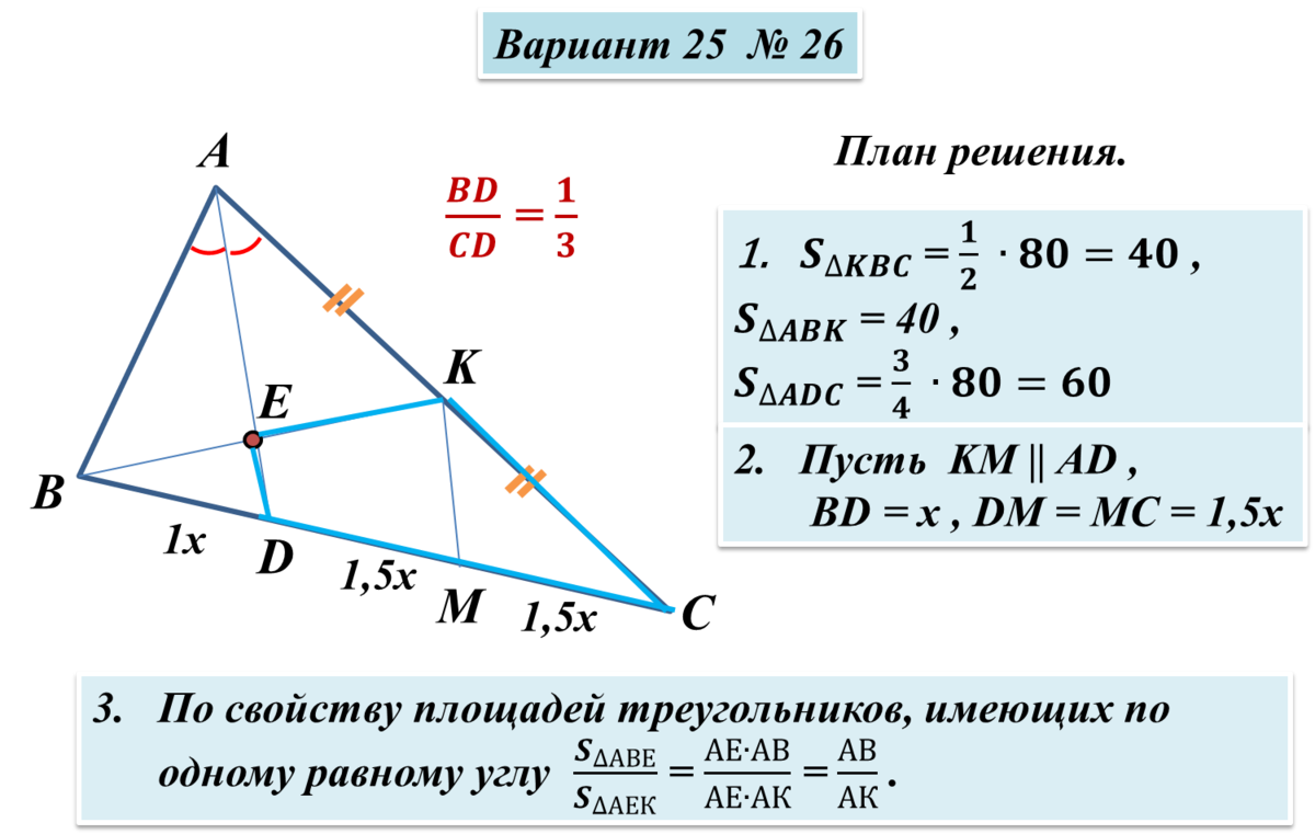 Площадь треугольника АВС равна 60 . Биссектриса АD пересекает медиану ВК в точке Е , при этом ВD : СD = 1 : 2 . Найдите площадь четырёхугольника EDСК .