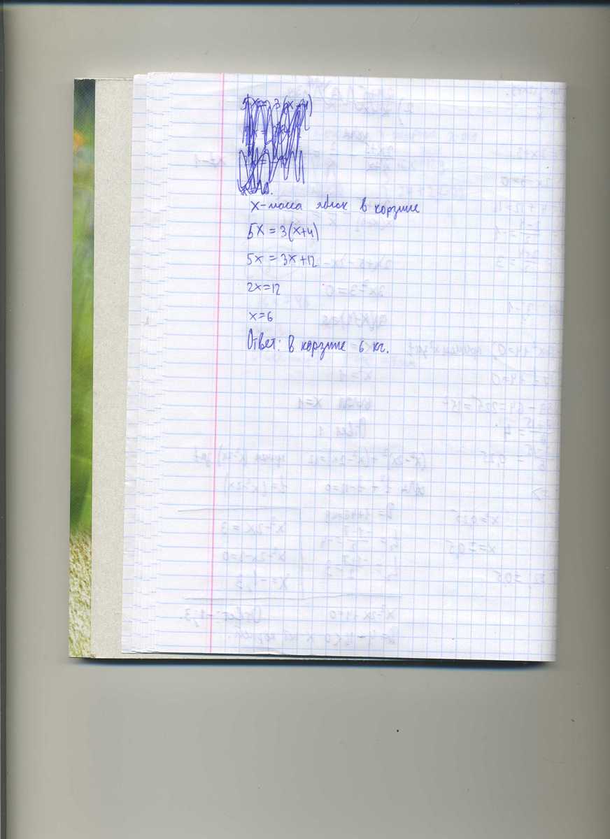 Решите задачу, составив уравнение. Яблоки из 5 корзин можно разложить в 3 ящика. Масса яблок в каждой корзине на 4 кг. меньше чем масса яблок в каждом ящике. Найдите массу яблок в одной корзине.